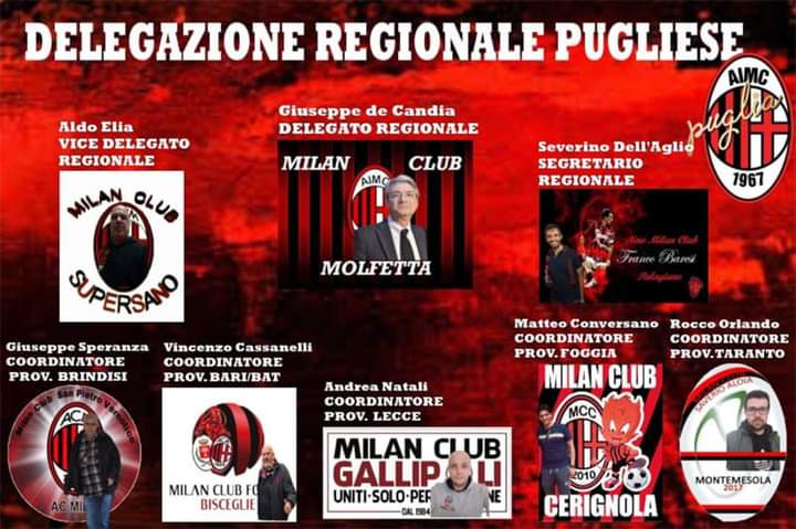 “Anche in tempi molto difficili – si legge nel comunicato – il legame con il nostro amatissimo Milan è sempre rimasto solido. Pur lontani dai ragazzi e da San Siro, l’amore per i colori rossoneri è ulteriormente cresciuto. Perciò in questi mesi i Milan Club pugliesi hanno lavorato alacremente per farsi trovare pronti, in vista (speriamo presto) del ritorno alla normalità. Il primo passo per esserlo è stata la nomina dei componenti del coordinamento regionale: Giuseppe De Candia (Milan Club Molfetta) è il nuovo coordinatore, Aldo Elia (MC Supersano) è il vice, mentre Severino Dell’Aglio (MC Palagiano) è il segretario. In passato De Candia, 62 anni, ha ricoperto il medesimo ruolo prima dell’arrivo di Angelo Gaeta, storica figura del tifo rossonero di Puglia e scomparso pochi mesi fa. Successivamente sono stati nominati i coordinatori provinciali: Vincenzo Cassanelli (MC Bisceglie) è il punto di riferimento dei club di Bari e Bat; Giuseppe Speranza (MC San Pietro Vernotico) coordina i club brindisini; Matteo Conversano (MC Cerignola) è il rappresentante dei milanisti di Foggia; Andrea Natali (MC Gallipoli) cura i club leccesi; infine Rocco Orlando (MC Montemesola) è il portavoce della provincia di Taranto. La comunicazione è stata affidata a Giuseppe Di Cera, Michele Pinto e Giacomo Ferrarese, mentre Mauro Pulpito è il nostro Brand Ambassador. Le attività che l’AIMC Puglia offrirà ai tifosi del Diavolo avranno luogo nel pieno rispetto delle attuali disposizioni nazionali, tese a vietare la creazione degli assembramenti. Ciò non impedirà di manifestare ugualmente, con rinnovata energia e orgoglio, la nostra appartenenza attraverso iniziative da sviluppare con l’ausilio dei social. L’obiettivo sarà avvicinare maggiormente i tifosi al mondo Milan, ad esempio attraverso trasmissioni online, che coinvolgano personalità legate al rossonero sotto ogni profilo“.