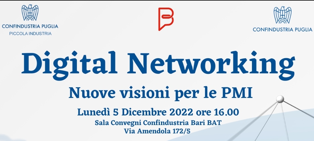 Lunedì 5 dicembre alle ore 16.00 presso la Sala Convegni di Confindustria a Bari si terrà l’evento dal titolo: “Digital Networking – Nuove Visioni per le PMI”