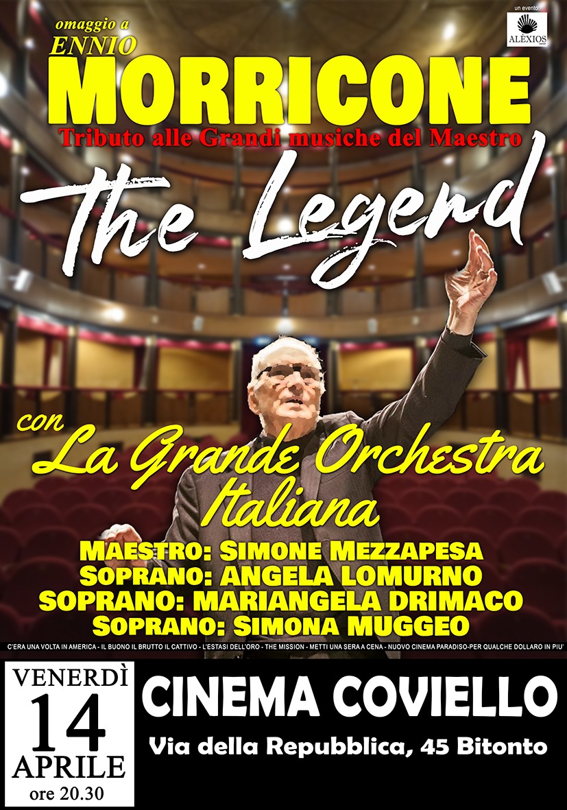 Da ”L’estasi dell’oro” a ”C’era una volta il west”, passando per ”Nuovo Cinema Paradiso” a ”Per qualche dollaro in più”, sarà un viaggio incredibile tra melodie rimaste nella memoria collettiva di intere generazioni lo spettacolo ”Morricone The Legend – Tributo alle grandi musiche del Maestro” in programma venerdi 14 Aprile 2023, alle ore 20.30, presso il Cinema Coviello di Bitonto (Ba).