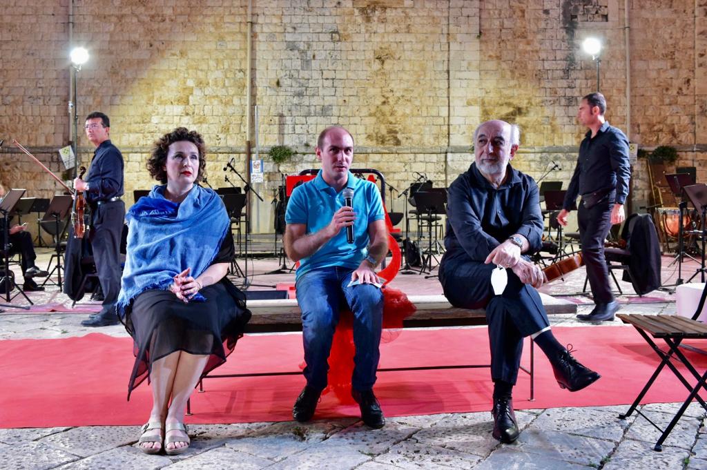 Ad andare in scena lo spettacolo sinfonico intitolato “Amor, ch’a nullo amato amar perdona” – Storie di amanti un po’…”sfigati” scritto da Maria Rita Chiarelli e diretto da Michele Cellaro intervistati ad inizio spettacolo da Sebastiano Coletta in diretta streaming. Nello splendido scenario l’orchestra ha intonato le note di Sergej Prokofiev Montecchi e Capuleti da “Romeo e Giulietta”, Georg Friederich Händel Sarabanda, Dmitrij Šostakovič Waltz n. 2 dalla Suite per Orch. Jazz, Nino Rota Romeo e Giuletta, Leonard Bernstein Somewhere da “West side story”, John Williams Star wars, Richard Strauss Also sprach Zarathustra op. 30, Ludwig van Beehthoven Sinfonia op.67 n.5 Primo movimento, Vasco Rossi- Alan Tdel aylor “Albachiara”, Shawn Mendes- Camila Cabello Señorita e Nicola Piovani La banda del pinzimonio. Ad arricchire la serata due danzatori, Francesca Sibilio e Nicola Simonetti, che si sono mossi sulle note dell’Orchestra, intrecciano con la musica e la parola un altro livello narrativo facendo si che lo spettacolo diventasse interattivo con il pubblico.
