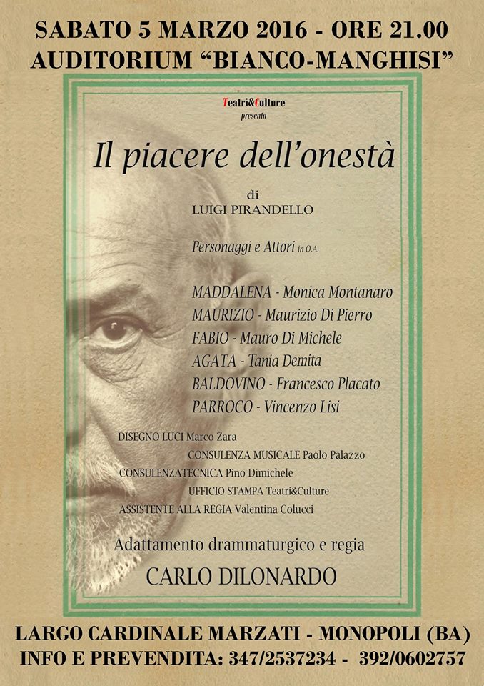 Dopo il successo, di pubblico e critica, ottenuto nelle diverse tappe in Puglia e a gennaio scorso a Roma, la compagnia Teatri & Culture, diretta dal regista, organizzatore teatrale e promotore culturale Carlo Dilonardo, presenta lo spettacolo Il piacere dell’onestà, di Luigi Pirandello, giunto alla quindicesima replica, in scena Sabato 5 Marzo, alle 21.00 presso l’Auditorium “Bianco-Manghisi”.
