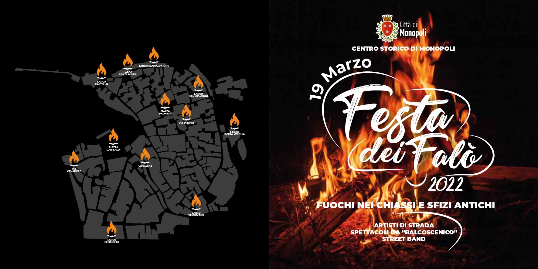 Dopo tre anni di assenza a causa della pandemia, la Città di Monopoli in sinergia con l’Associazione Operatori Centro Storico organizza “La Festa dei Falò – Fuochi nei Chiassi e Sfizi Antichi”, nel segno della tradizione, con musica popolare, giochi e laboratori per bambini, zeppole e tanto divertimento.