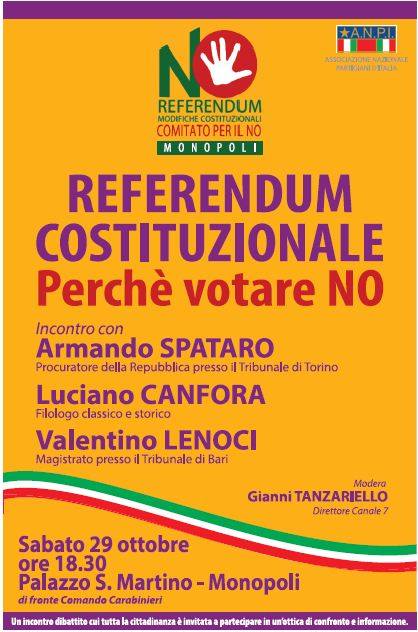Sono loro gli illustri ospiti dell’incontro organizzato dal Comitato cittadino di Monopoli per il NO al Referendum Costituzionale che si terrà sabato 29 ottobre alle 18.30 presso Palazzo San Martino.