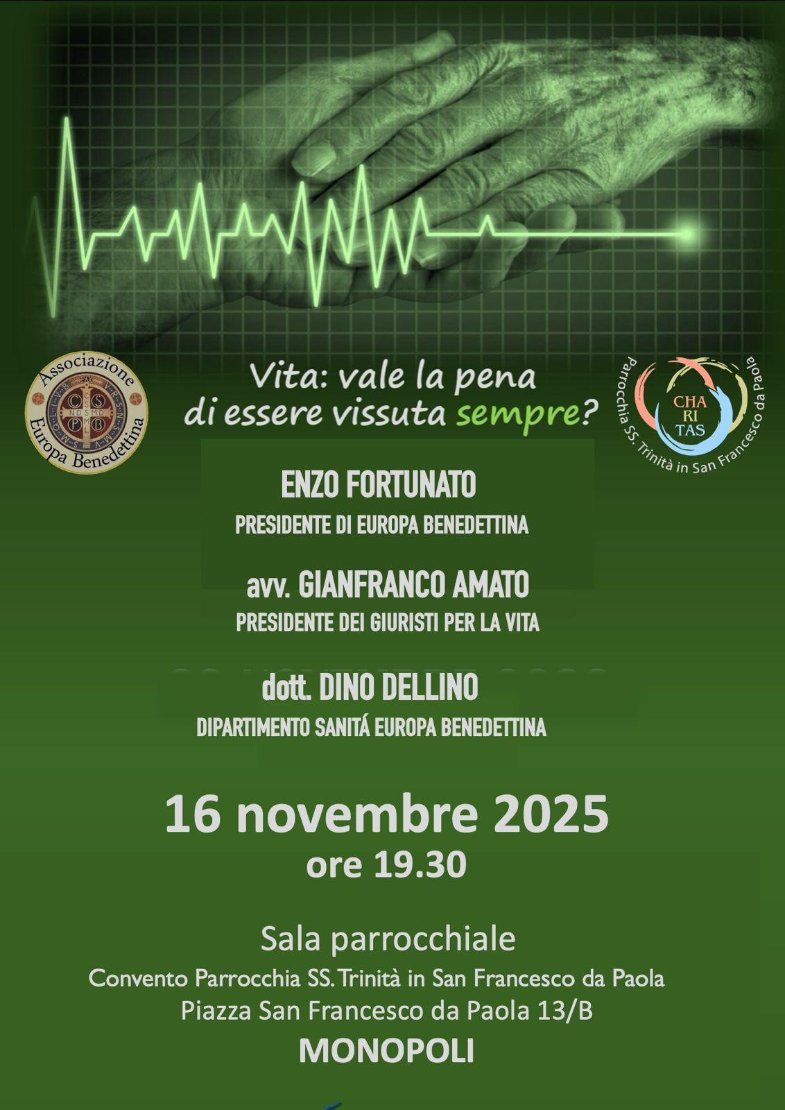 Domenica 16 novembre, alle ore 19:30, presso il Convento Parrocchia Ss. Trinità in San Francesco da Paola a Monopoli, si terrà una conferenza dal titolo “Vita: vale la pena di essere vissuta sempre?”, un appuntamento aperto a tutta la cittadinanza dedicato alla riflessione sul significato e sul valore della vita umana.