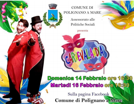 Il Comune di Polignano a Mare, con delibera n. 24 del 08/02/2021, ha promosso l’iniziativa “Carnevalandia” proposta dall’artista polignanese Lorenzo Torres e dal suo collega Vito Di Leo. Si tratta di un format televisivo a tema carnevalesco studiato per il web e rivolto ai bambini. “Ci è sembrato un modo semplice e diretto per arrivare ai bambini che, sebbene si siano più facilmente adeguati al periodo storico fatto di restrizioni e privazioni, hanno sofferto e soffrono la mancanza di incontri, di abbracci, di aggregazione” fa sapere il Sindaco, Domenico Vitto. Il format sarà sviluppato in due puntate della durata di 30 minuti circa e tratterà attività ludiche e di intrattenimento sfruttando le potenzialità della ballon-art, della magia, dei quiz e della comicità. Gli eventi, saranno trasmessi sulla pagina Facebook del Comune di Polignano a Mare, nelle giornate di domenica 14 e martedì 16 febbraio alle ore 16.30.