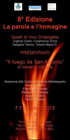 Avrà luogo il 7 febbraio prossimo l’8^ edizione della manifestazione culturale “La parola e l’immagine”, con il poeta Gerardo Carrera, le foto di Carlo Cigliola, i disegni di Enza Colamussi, le sculture di Yanira Delgado, le poesie di Maria D. Talenti, reading di Vincenzo Pellegrini e Rosaria Testini, musica Marco Cavone.