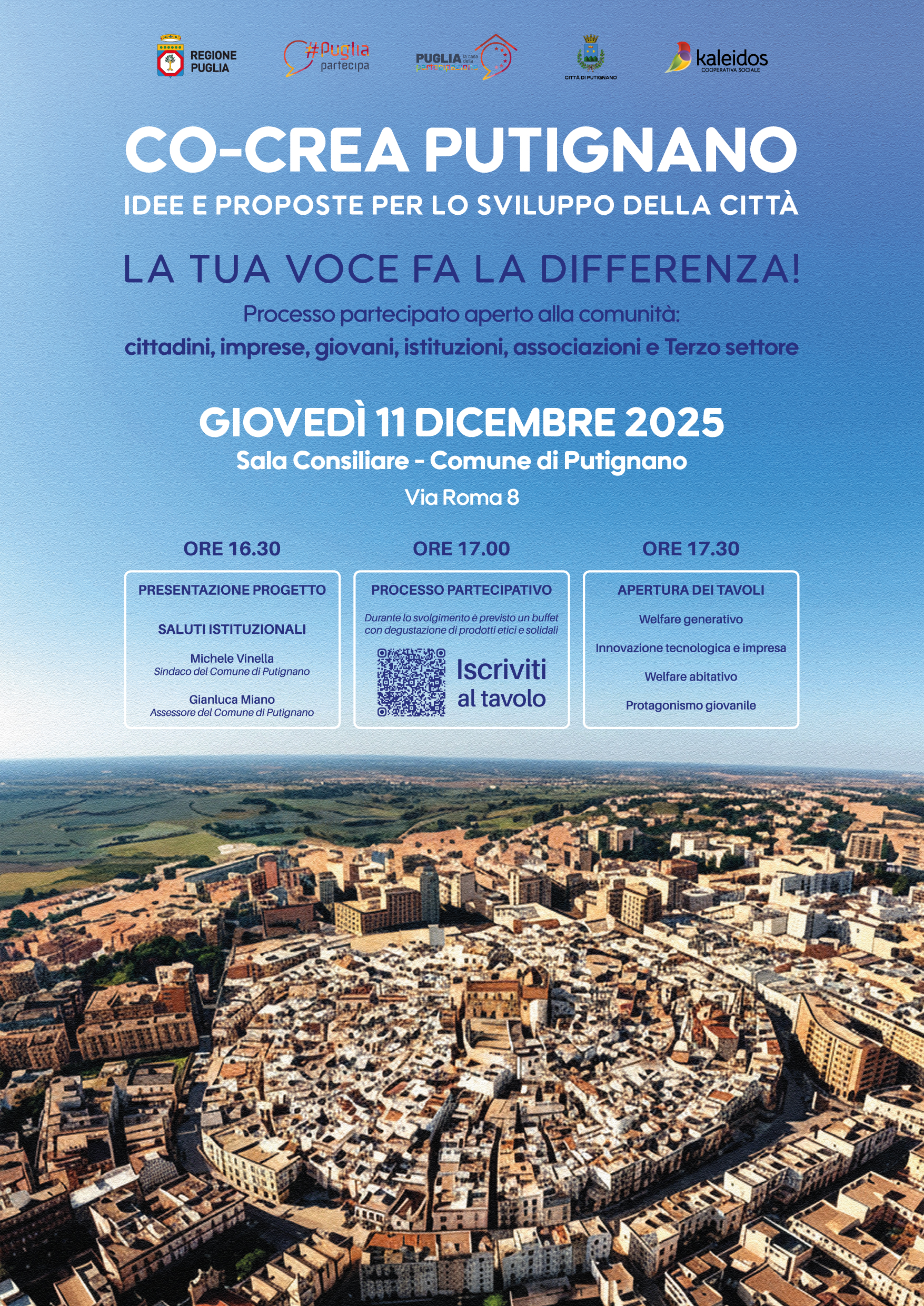 “Co-Crea Putignano” non sarà dunque un appuntamento isolato, ma l’inizio di un metodo nuovo, una strategia che mette al centro le persone e considera la partecipazione non un’appendice, ma il cuore del percorso di sviluppo.