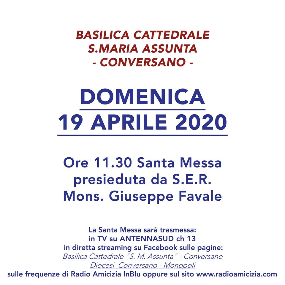 CONVERSANO Oggi, domenica 19 aprile, il vescovo della Diocesi Conversano-Monopoli celebrerà la Santa Messa domenicale nella Basilica Cattedrale di Conversano, chiusa al pubblico per le note disposizioni che riguardano il contenimento del Covid-19. Pertanto la celebrazione verrà trasmessa in diretta streaming sulla nostra Pagina Facebook, su quella della Basilica Cattedrale, in diretta in Tv su ANTENNASUD (canale 13 del Digitale Terrestre) e sull’emittente diocesana Radio Amicizia.