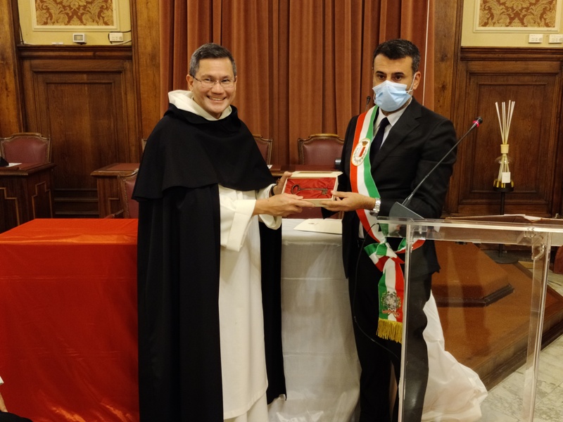 Ieri pomeriggio, in occasione dell’8° centenario (1221-2021) del “Dies Natalis” di San Domenico di Guzman, Fondatore dell’Ordine dei Predicatori, e del 70° anniversario (1951-2021) dell’affidamento, da parte della Santa Sede, della Basilica Pontificia San Nicola all’Ordine dei Predicatori, il sindaco Antonio Decaro ha consegnato le Chiavi della Città a Fr. Gerard Francisco TIMONER III OP, Maestro dell’Ordine dei Predicatori e 87° successore di San Domenico, nel corso di una cerimonia che si è svolta nella sala consiliare “Enrico Dalfino”, a Palazzo di Città.