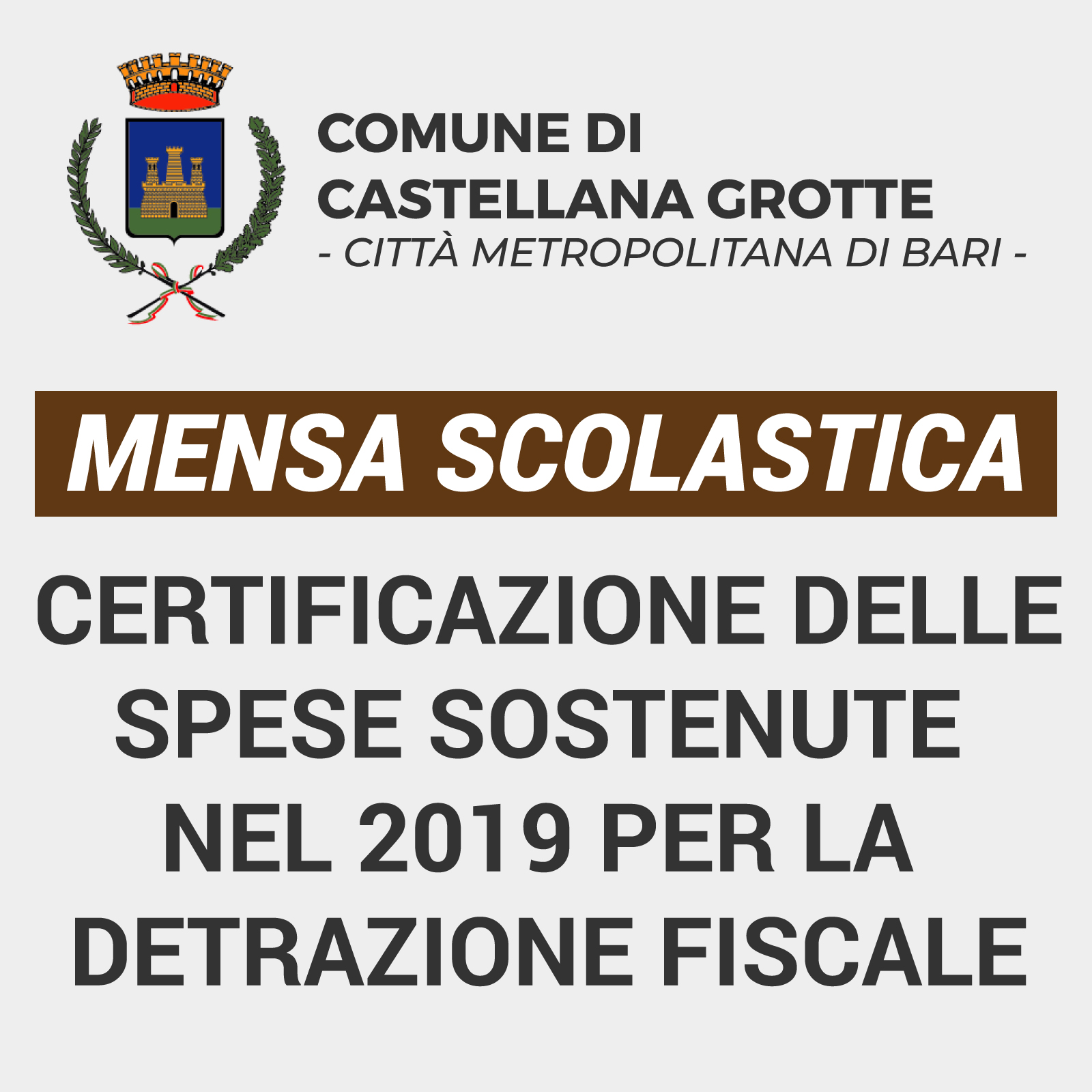 L’Ufficio Pubblica Istruzione del Comune di Castellana Grotte informa che è disponibile online la certificazione delle spese sostenute per il servizio di mensa scolastica, anno 2019, valido per la detrazione della spesa in fase di redazione della dichiarazione dei redditi 2020 (730 ed unico relative ai redditi dell’anno 2019).