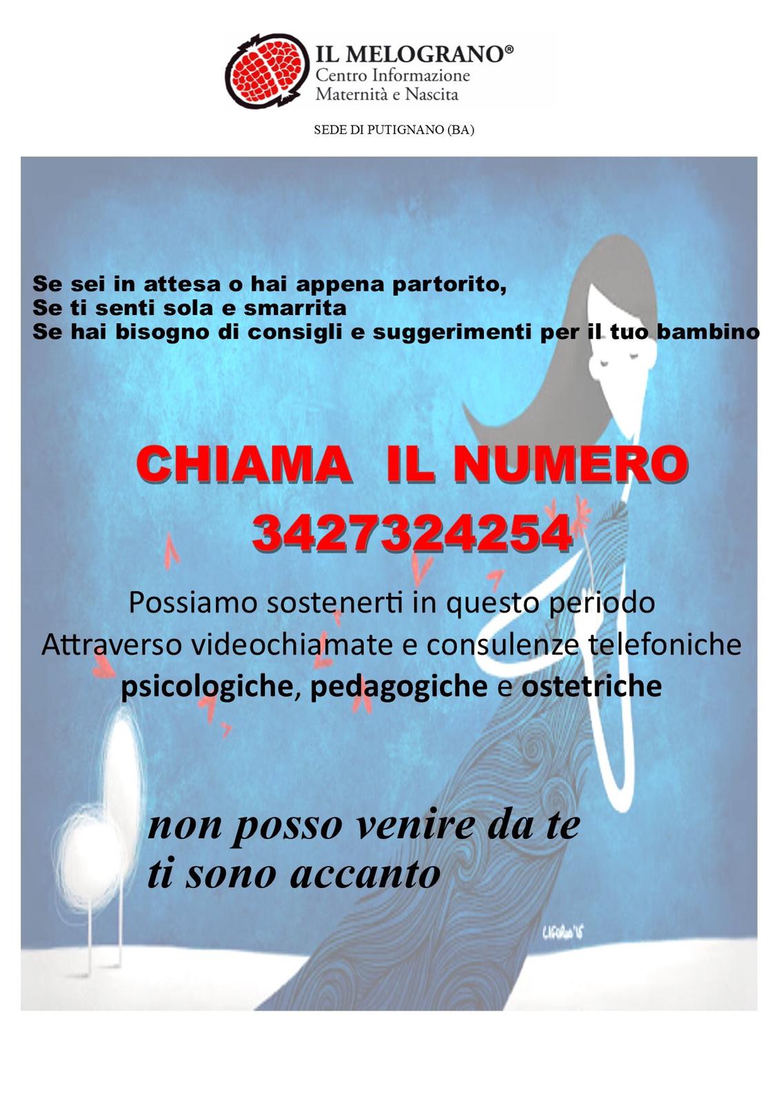 L’associazione Il Melograno – centro informazione maternità e nascita, con sede a Putignano, garantisce anche alle gestanti e alle neo-mamme di Castellana Grotte un servizio di assistenza telefonica con consulenze psicologiche, pedagogiche ed ostetriche. Basterà contattare il numero 342/7324254 e si potrà usufruire di tutti i servizi che il centro fornisce abitualmente.