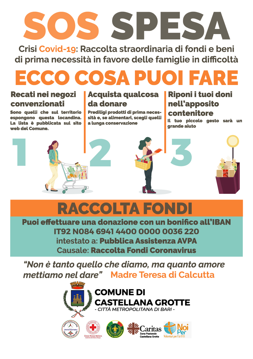 Nasce a Castellana Grotte “SOS Spesa”, una raccolta straordinaria di fondi e beni di prima necessità da destinare alle famiglie in difficoltà per via della crisi generata dal Coronavirus. I cittadini che vorranno dare il loro contributo potranno recarsi, a partire da martedì 31 marzo 2020, presso i negozi convenzionati riconoscibili sul territorio perché espongono la locandina con il logo di “SOS Spesa”. La lista completa sarà pubblicata sul sito web del comune di Castellana Grotte. Presso i suddetti esercenti i cittadini potranno acquistare beni di prima necessità da donare alle famiglie in difficoltà, depositandoli all’interno dell’apposito contenitore con annesso logo, sito all’interno del punto vendita. Giornalmente i volontari si occuperanno del ritiro della merce che sarà condotta nei punti di raccolta Caritas della zona pastorale di Castellana Grotte. La distribuzione ai richiedenti avverrà con il coordinamento dei servizi sociali comunali. Parallelamente alla raccolta beni di prima necessità è stata attivata una raccolta fondi attraverso il conto corrente dedicato IT92 N084 6941 4400 0000 0036 220 intestato a Pubblica Assistenza AVPA. Servirà per soddisfare le richieste più urgenti dei cittadini in difficoltà. Gli esercenti che vogliono convenzionarsi possono comunicare la propria disponibilità a comunicazione@comune.castellanagrotte.ba.it