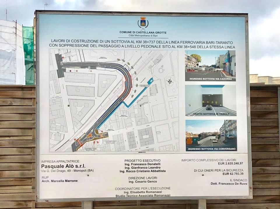 Riprenderanno probabilmente lunedì i lavori del Sottopasso di Via Conversano a Castellana Grotte. A stabilirlo, a patto che vengano rispettate le disposizioni in materia di contenimento del coronavirus, il Prefetto di Bari dopo la sollecitazione dell’Amministrazione Comunale che, con una lettera a firma del sindaco Francesco De Ruvo e condivisa con l’assessore ai Lavori Pubblici Franca de Bellis, ha chiesto la riapertura del cantiere.