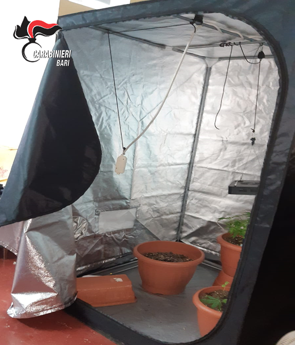 Dopo diversi servizi di osservazione, i Carabinieri della Stazione di Turi hanno fatto irruzione nel box, di pertinenza di un’abitazione ubicata nel centro abitato di Turi. All’interno, i militari hanno sorpreso tre giovani, tutti poco più che ventenni, mentre stavano esfoliando alcune grosse piante di cannabis. Nel locale, della grandezza di circa 20 mq, gli operanti hanno accertato l’esistenza di un grow box, una serra composta da una piccola tenda isotermica autoventilata, lampade a neon, una lampada a infrarossi, termometro, prodotti fertilizzanti, con all’interno tre piante di cannabis indica.