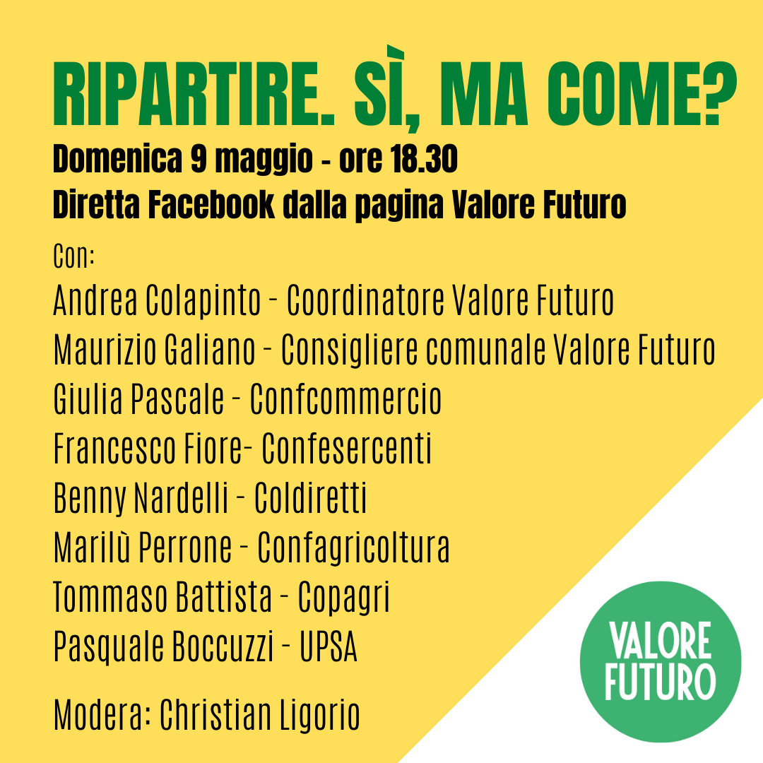 Intervengono Andrea Colapinto (Coordinatore Valore Futuro), Maurizio Galiano (Consigliere comunale Valore Futuro), Giulia Pascale (Confcommercio Conversano), Francesco Fiore (Confesercenti Conversano), Benny Nardelli (Coldiretti Conversano), Marilù Perrone (Confagricoltura), Tommaso Battista (Copagri), Pasquale Boccuzzi (Confartigianato Conversano). Modera Christian Ligorio.