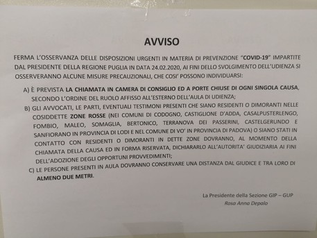 Coronavirus, al Tribunale di Bari udienze a porte chiuse, rinvio delle cause con parti che provengono dalle zone focolaio e sospensione degli eventi di formazione, sono alcune delle linee guida individuate per gli uffici giudiziari baresi “nell’ambito delle misure di contenimento e gestione dell’emergenza epidemiologica da Covid-19”, riporta una nota dell’Ansa. Il provvedimento, che elenca 12 misure da seguire per le udienze e le attività degli uffici, è stato adottato al termine di una riunione. Il provvedimento precisa che “l’attività giudiziaria sarà regolarmente svolta non essendo stati assunti dalle autorità competenti, né a livello nazionale né a livello locale, provvedimenti di chiusura generalizzata degli uffici pubblici” e che “i soli soggetti, parti processuali, difensori, testimoni, consulenti, periti, autorizzati, anzi invitati, a non comparire, sono coloro che provengono dalle zone cosiddetto focolaio, per le quali è stato disposto il divieto per la popolazione di allontanarsi da detti luoghi”.