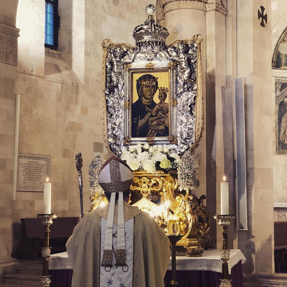 Un’immagine commovente che ricorderemo a lungo: il vescovo monsignor Giuseppe Favale in preghiera davanti all’icona di Maria Santissima della Fonte che affida la città di Conversano e la diocesi alla Patrona della città e di tutta la comunità diocesana. E’ accaduto ieri sera nella Basilica Cattedrale di Conversano. Al termine della solennità liturgica in onore della Madonna della Fonte, il vescovo ha affidato tutti i fedeli a Dio, alla Vergine Maria attraverso una preghiera in queste giornate difficili per il coronavirus. Il religioso ha chiesto di proteggere tutti dal contagio: “A Te Maria, Fonte di Vita, ci affidiamo in questo momento”! Il Solenne Pontificale si è svolto a porte chiuse. Oltre alla preghiera di affidamento, ci sono stati momenti di riflessione e di supplica davanti all’immagine della «Madonna della Fonte»: a Lei è stato chiesto di proteggere i malati di coronavirus, coloro che li assistono, tutti i lavoratori, gli anziani e chi è in difficoltà. Presente, a nome della città, il sindaco Pasquale Loiacono.