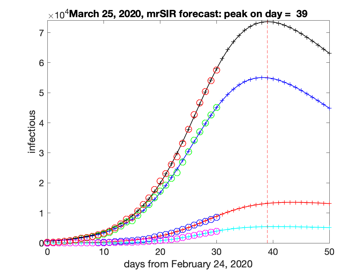 Una delle principali preoccupazioni legate allo studio della recente pandemia virale è quella di prevederne l’evoluzione. In uno studio in progress dei Dipartimenti di Matematica delle Università di Firenze e Bari si sta studiando l’andamento giornaliero dei contagi nel nostro Paese. Il modello iniziale (denominato SIR di base) ha mostrato interessanti potenzialità nel fornire previsioni accurate sulla diffusione della malattia per i giorni successivi ma una estensione multi-regione di tale modello matematico (mrSIR) ha consentito anche di tracciare una previsione per macroregioni (Nord, Centro e Sud) che presentano evidenti dati disomogenei tra loro. Per una migliore lettura dell’allegata tabella, che considera i dati forniti dalla protezione civile nella giornata del 25 marzo 2020, le crocette si riferiscono alla previsione per i prossimi giorni. La curva di colore nero indica l’Italia, il blu=Nord, rosso=Centro e celeste=Sud.