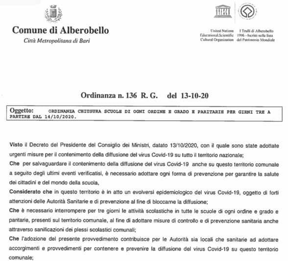 Il sindaco di Alberobello Michele Longo ha firmato, nelle scorse ore, una ordinanza di chiusura scuole di ogni ordine e grado e paritarie nei giorni 14-15-16 ottobre. “Si comunica che con ordinanza n. 136 del 13-10.20 si ordina per i giorni 14-15-16 ottobre la chiusura di tutte le scuole di ogni ordine e grado del Comune di Alberobello, nessuna esclusa, comprese le scuole paritarie, fatti salvi altri eventuali provvedimenti”, la nota del Comune. Che così prosegue: “La decisione è stata presa al fine di adottare misure di controllo e di prevenzione sanitaria anche attraverso sanificazioni dei plessi scolastici comunali”. L’adozione di questo provvedimento “contribuisce per le autorità sia locali che sanitarie ad adottare accorgimenti e provvedimenti per contenere e prevenire la diffusione da Covid sul territorio comunale in quanto al momento è necessario salvaguardare la salute degli studenti nonché di tutto il personale docente e non docente, le famiglie, gli anziani”. Il timore riguarda la temuta diffusione dei contagi rilevati nella casa di riposo Giovanni XXIII che ospita 60 anziani e 20 operatori.