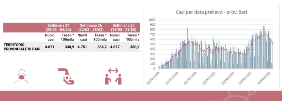 Il report registra per l’Area Metropolitana di Bari (29 marzo-4 aprile) 4.071 nuovi casi, in discesa nel confronto con la settimana precedente: il tasso per 100mila abitanti si attesta così a quota 330,9. Sono 24 i comuni oltre il livello di 250 nuovi casi per 100mila abitanti, contro i 26 di sette giorni fa.