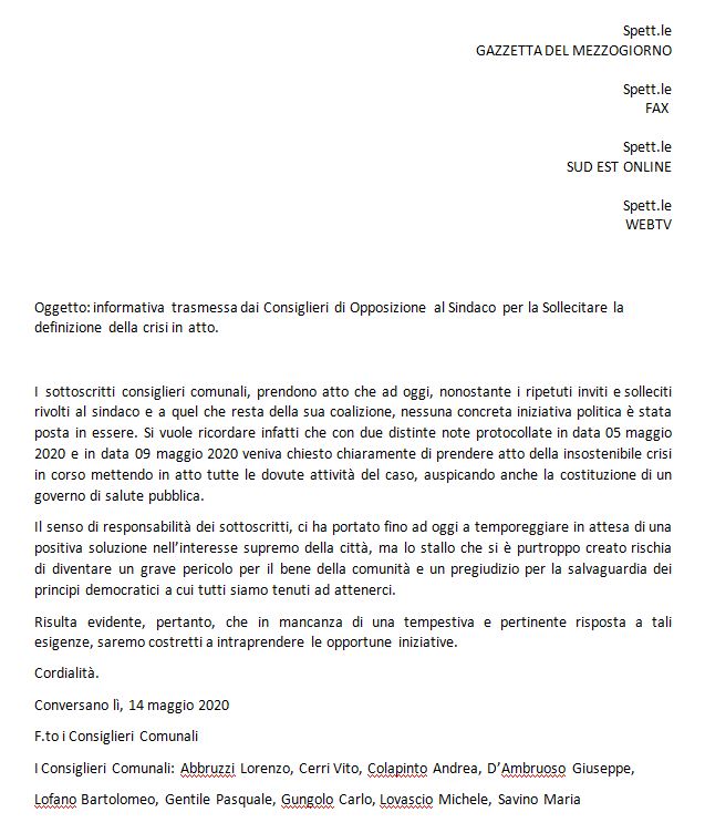 I sottoscritti consiglieri comunali, prendono atto che ad oggi, nonostante i ripetuti inviti e solleciti rivolti al sindaco e a quel che resta della sua coalizione, nessuna concreta iniziativa politica è stata posta in essere. Si vuole ricordare infatti che con due distinte note protocollate in data 05 maggio 2020 e in data 09 maggio 2020 veniva chiesto chiaramente di prendere atto della insostenibile crisi in corso mettendo in atto tutte le dovute attività del caso, auspicando anche la costituzione di un governo di salute pubblica.