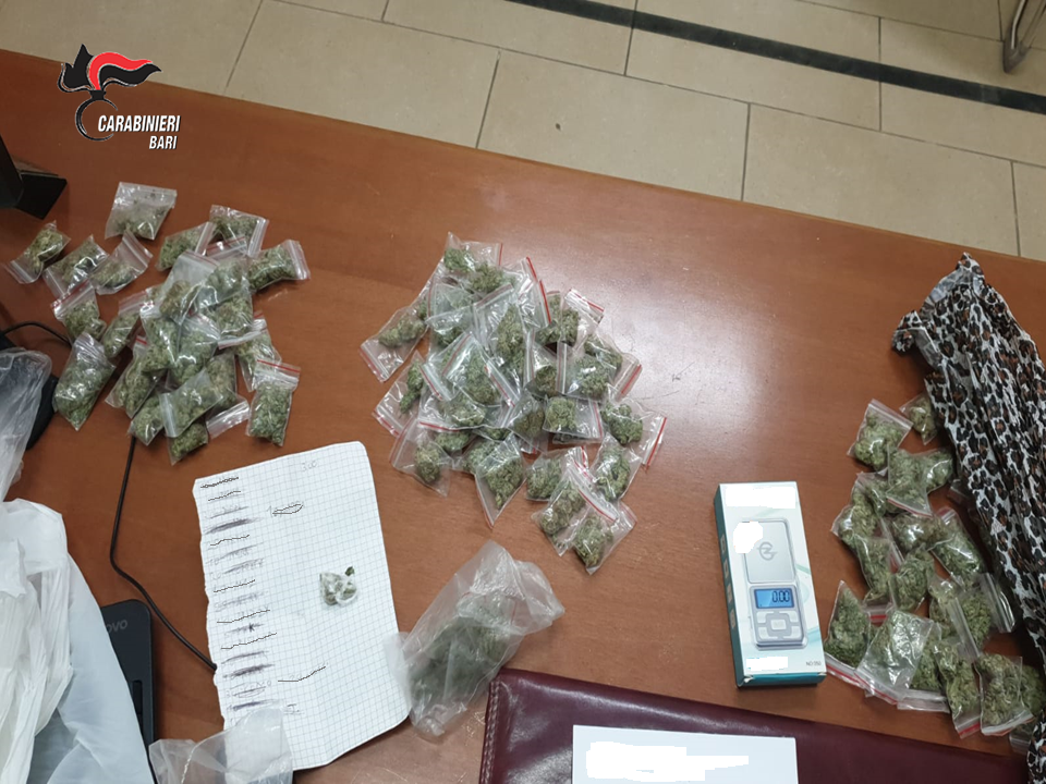 Un strano andirivieni nei pressi di un noto bar del luogo, aveva incuriosito i militari che hanno deciso di approfondire la situazione. Infatti subito raggiunto il locale, i predetti hanno notato dei movimenti sospetti da parte di un giovane comodamente seduto ad un tavolo in compagnia di altri due coetanei; all’atto del controllo il ragazzo ha prima mostrato segni di nervosismo e, poi, alzatosi repentinamente è fuggito via. Ne è scaturito un inseguimento a piedi protrattosi per diversi minuti lungo le vie principali del paese, tra l’altro a quell’ora molto trafficate. Durante la fuga ha cercato anche di disfarsi di un involucro in cellophane, subito recuperato, lanciandolo nell’erba alta dei giardinetti di via Di Vittorio, dove, ormai stanco, si è nascosto in un vicolo condominiale. Qui è stato immediatamente raggiunto dal militare che lo seguiva e da due carabinieri liberi dal servizio, i quali hanno subito dato ausilio ai colleghi, consentendo di poter bloccare in sicurezza in fuggitivo. Una volta identificato, P.G. è stato sottoposto ad accurata perquisizione personale e domiciliare che ha permesso di rinvenire N. 96 (novantasei) bustine in cellophane trasparente con chiusura autosigillante, contenenti sostanza stupefacente del tipo “infiorescenze di marijuana” del peso lordo di grammi 102,50. In più, sempre all’interno del domicilio, nella cameretta di P.G., è stato rinvenuto una infiorescenza di marijuana, avvolta in pellicola trasparente, del peso lordo di grammi 1,00; dodici bustine vuote in cellophane trasparente con chiusura autosigillante e infine un foglio di quaderno a quadretti manoscritto, riportante nomi e numeri, sul conto dei quali saranno esperite verifiche e riscontri.
