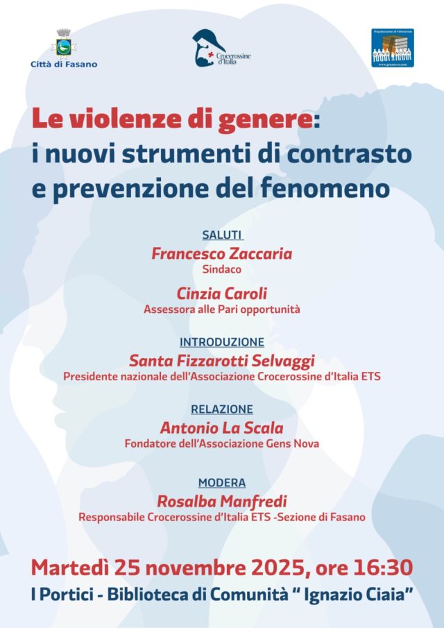 L’appuntamento, intitolato “Le violenze di genere: i nuovi strumenti di contrasto e prevenzione del fenomeno”, si terrà alle 16:30 nella suggestiva cornice de I Portici – Biblioteca di Comunità Ignazio Ciaia. L’iniziativa è promossa dal Comune di Fasano insieme alla Croce Rossa Italiana – Sezione Crocerossine d’Italia ETS, con l’obiettivo di unire denuncia e azione concreta.