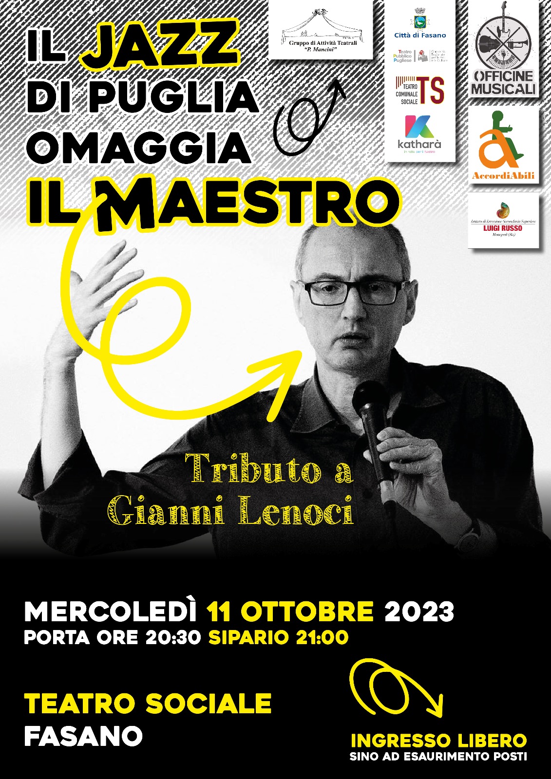 Il Gruppo di Attività Teatrali “Peppino Mancini” di Fasano torna a omaggiare, per il secondo anno consecutivo, l’artista monopolitano Gianni Lenoci con «Il jazz di Puglia omaggia il Maestro – Tributo a Gianni Lenoci», un evento musicale in programma al Teatro Sociale di Fasano mercoledì 11 ottobre alle 21.00.
