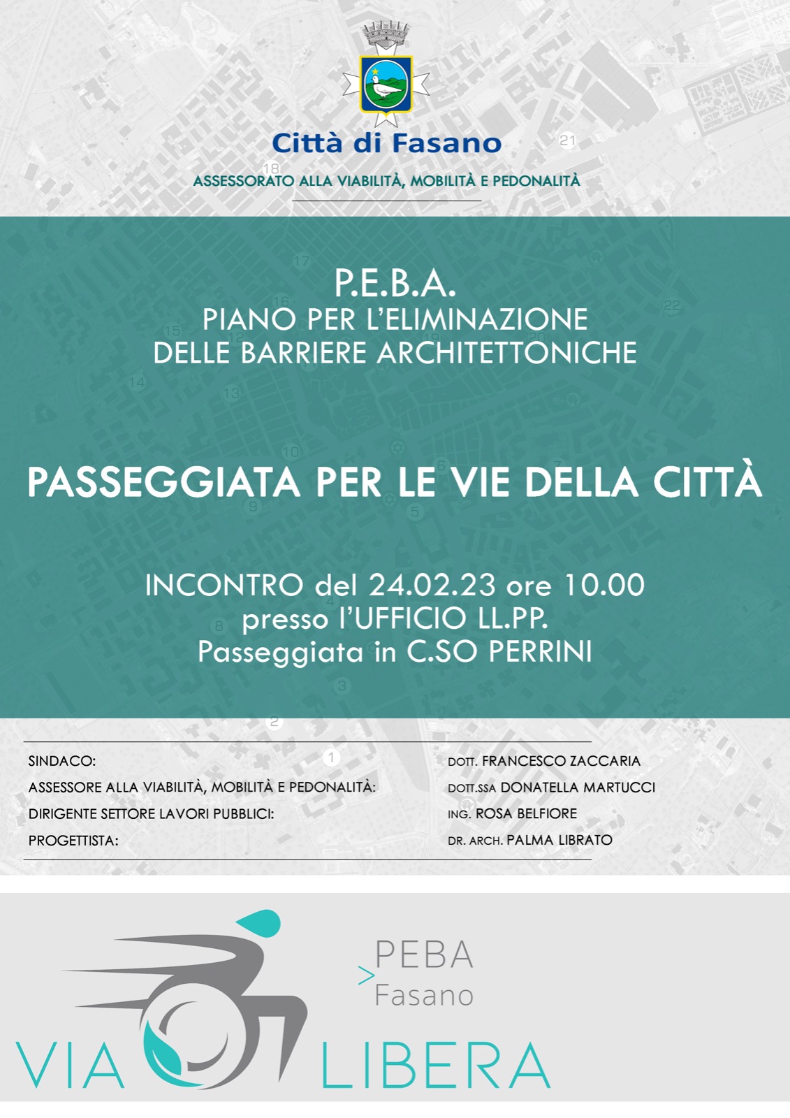 Una passeggiata nella città, lungo alcuni percorsi principali, con i cittadini interessati e i tecnici progettisti, per pianificare la Fasano di domani, una città a misura di tutti che non lascia indietro nessuno, priva di ostacoli, accessibile e adattata alle esigenze di ciascuno e, soprattutto, costruita insieme ai cittadini, partendo dalle necessità e dai bisogni di chi vive il territorio quotidianamente. Lo aveva annunciato l’assessore alla Viabilità, Mobilità e Pedonalità Donatella Martucci durante il primo incontro di presentazione del Peba – Piano per l’eliminazione delle barriere architettoniche.
