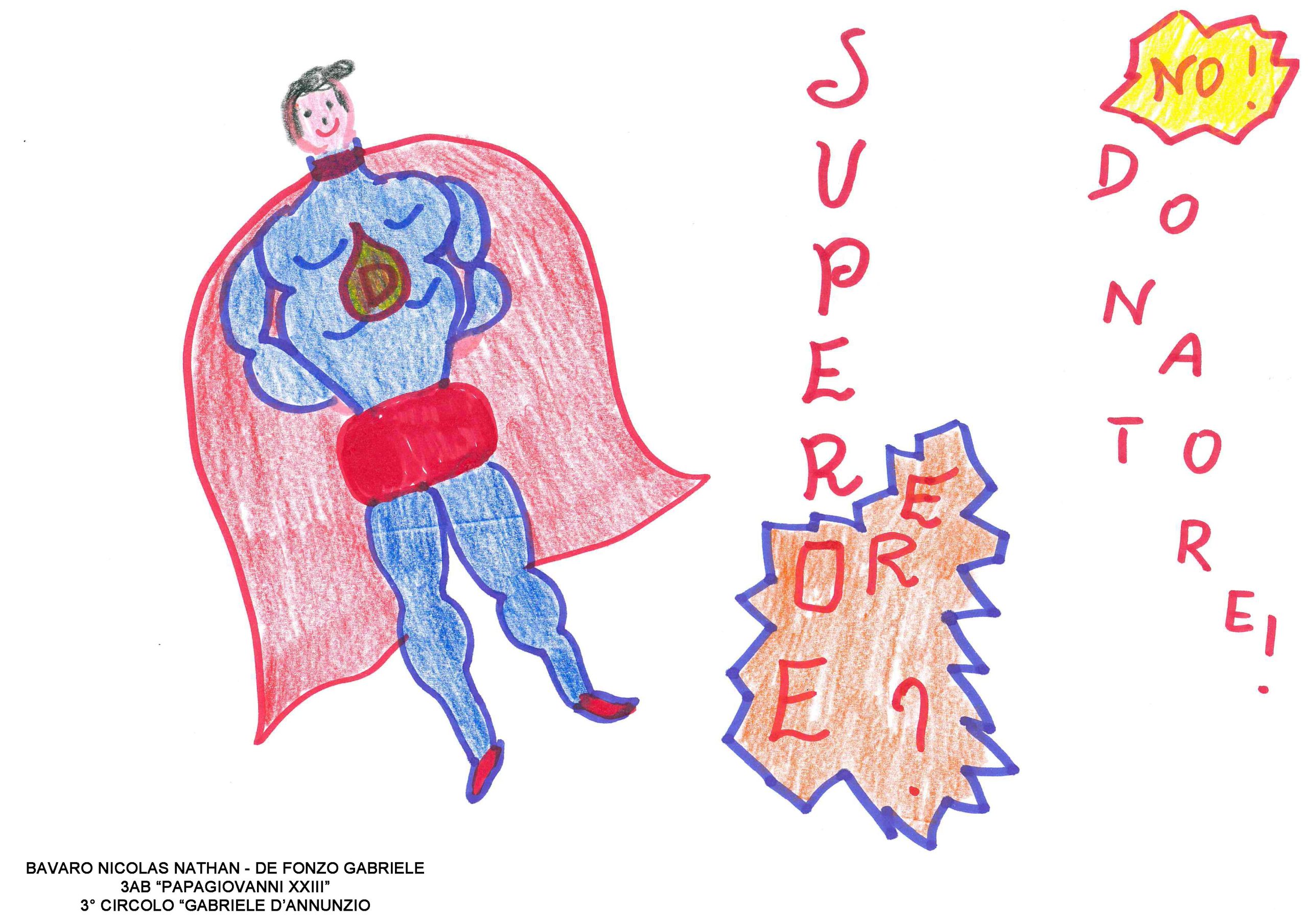 “Supereroe? No, donatore” è il titolo del disegno realizzato da due studenti della classe ex IIIB, attualmente VB, del III Circolo Didattico D’Annunzio di Trani, ultimo dei lavori meritevoli di premiazione per la fase provinciale del concorso “A scuola di dono 2020”, promosso da Fidas Nazionale e riservato agli studenti delle Scuole Primarie, delle Scuole secondarie di I grado e delle Scuole secondarie di II grado.