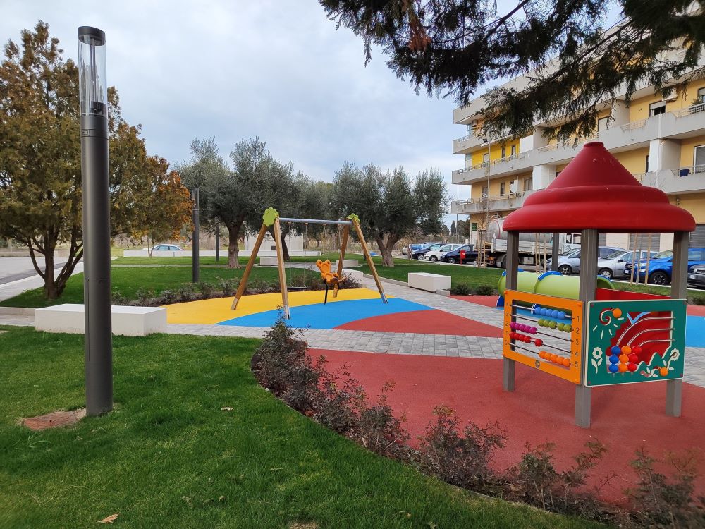 Nello specifico si è proceduto con la realizzazione di percorsi pedonali fruibili da tutti, di aree verdi con la posa di tappeto erboso e la messa a dimora di piante arbustive e, infine, di uno spazio ludico inclusivo con pavimentazione antitrauma in gomma multicolore, un’altalena a doppia postazione, una giostra rotante, un tunnel gattonabile e una struttura con pannelli sensoriali.