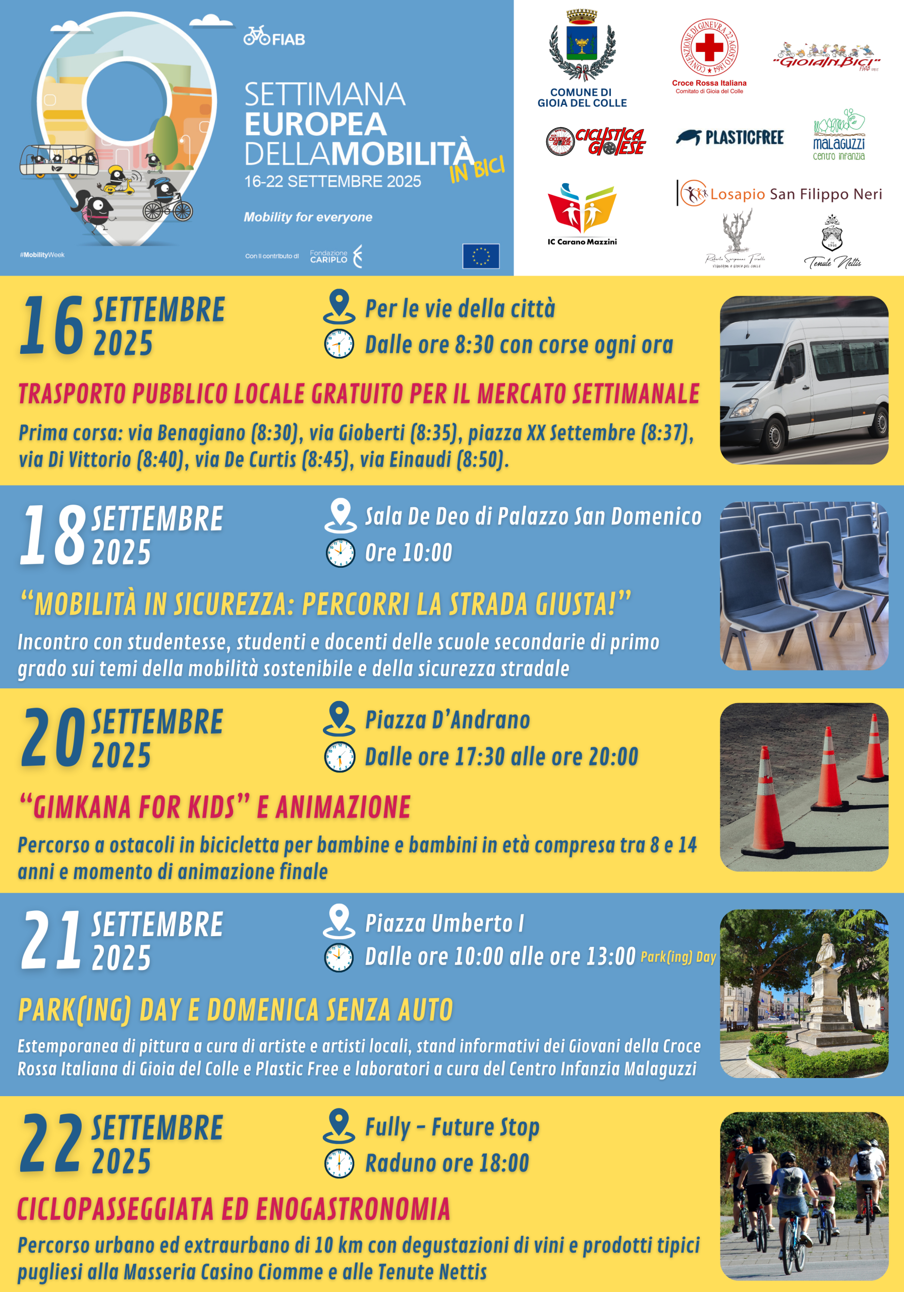 Sabato 20 settembre piazza Luca D’Andrano ospiterà la Gimkana for Kids: un percorso ciclabile a ostacoli per bambini e ragazzi (8-14 anni), seguito da animazione. Domenica 21 toccherà al Park(ing) Day: piazza Umberto I diventerà spazio di socialità con pittura estemporanea, laboratori, attività ambientali e di educazione stradale. Nella stessa giornata si terrà anche la Domenica senza auto, per promuovere stili di spostamento alternativi.