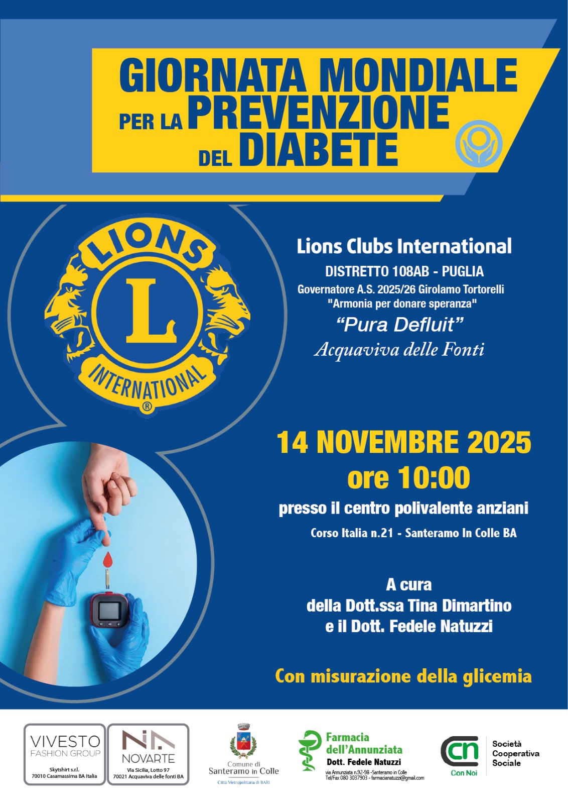 L’appuntamento è a Santeramo per una giornata di screening e sensibilizzazione sul diabete, una patologia che i Lions Club International considerano una priorità globale.