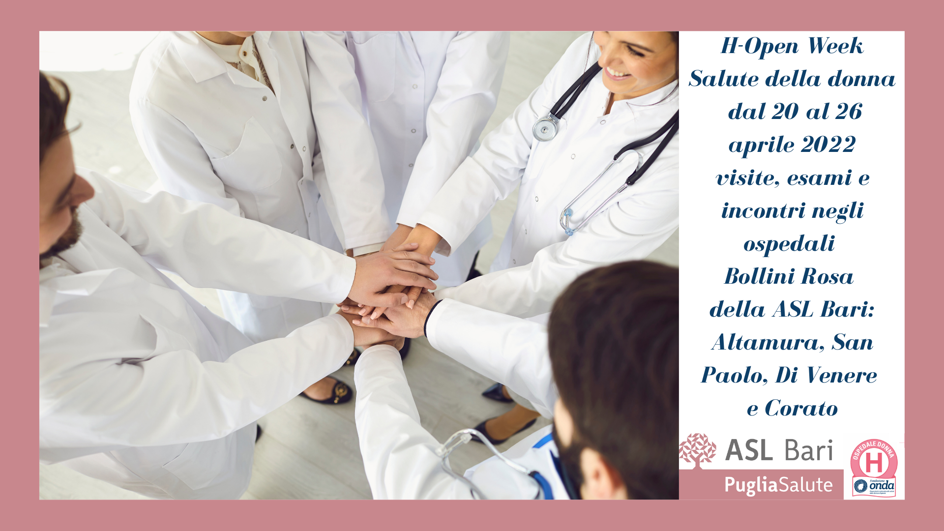 Un calendario fitto di iniziative e quattro ospedali coinvolti nella settimana dedicata alla Salute della donna. Quest’anno, in occasione della 7a Giornata nazionale della salute della donna (22 aprile), la Fondazione Onda dedicherà la settimana dal 20 al 26 aprile alle donne con l’obiettivo di promuovere l’informazione, la prevenzione e la cura al femminile in 271 ospedali sparsi in tutta Italia. La ASL Bari parteciperà con i suoi quattro presidi aderenti alla rete degli ospedali “Bollini Rosa”, Altamura, Corato, “Di Venere” e San Paolo Bari, in cui saranno offerti gratuitamente servizi clinici, diagnostici e informativi (in presenza e a distanza) in diverse aree specialistiche.