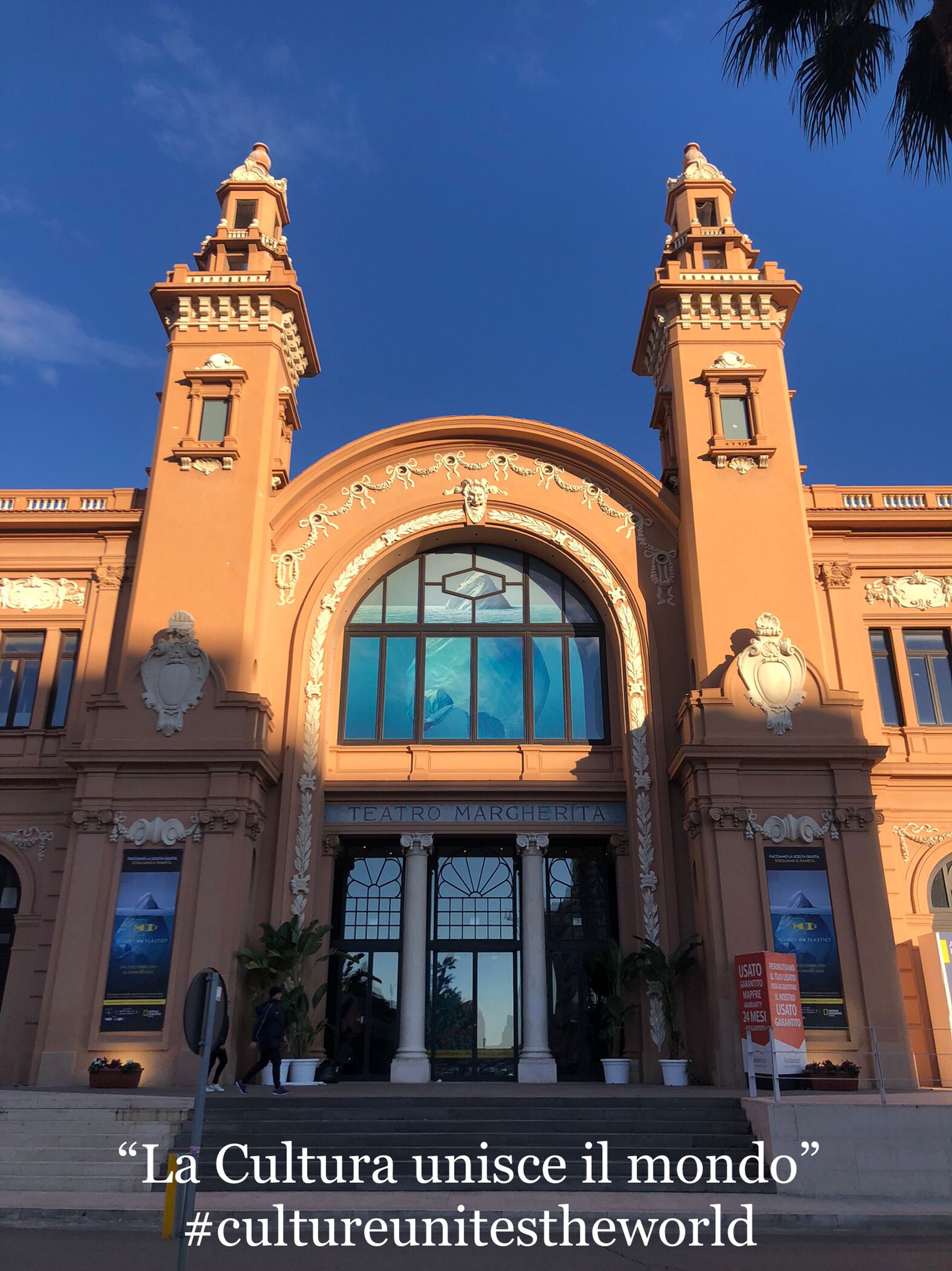 L’immagine scelta dall’assessora Ines Pierucci per veicolare gli hashtag #cultureunitestheworld e #museumsagainstwar è quella del prospetto del teatro Margherita che, naturalmente proteso verso il mare, rappresenta plasticamente l’idea del dialogo con l’altra sponda del nostro mare Adriatico e dell’apertura all’altro.