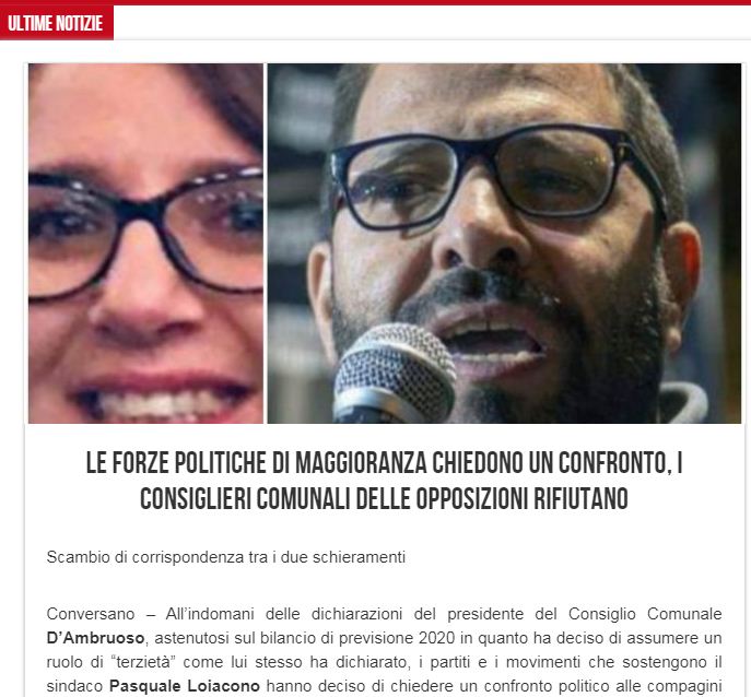 Crisi e disinformazione al Comune di Conversano. Così Oggiconversano, il blog gestito dall’assessore Rotunno, attacca l’opposizione: “Le forze politiche di maggioranza chiedono un confronto. I consiglieri comunali delle opposizioni rifiutano”. Chiaramente la vicenda, come potete verificare dai documenti e dai servizi giornalistici pubblicati su questo giornale, raccontata da Oggiconversano non sta in questi termini. Questi i fatti. La crisi in seno alla vecchia maggioranza di Loiacono è esplosa il 14 aprile, nel giorno dell’approvazione del bilancio, quando la vecchia maggioranza (Leu, Psi, Id, Punto, Conversano futura e Città Nostra) riuscì a salvarsi grazie all’astensione dell’opposizione (Cultura Pugliese, Puglia Popolare,Conversano a Sud Est, Conversiamo, Lega Salvini Premier e Cittadini Protagonisti). Già in quel consiglio comunale (il video integrale della seduta è visibile su youtube) e nei giorni successivi l’opposizione chiese al sindaco di conferire in consiglio e di aprire un confronto nella sede istituzionale, valutando la possibilità di aprire ad un governo istituzionale di larghe intese che faccia fronte all’emergenza. Da quel giorno, il sindaco e i suoi “lealisti” non hanno dato più segni di vita, hanno cominciato a lanciare strali contro il presidente Dambruoso e l’opposizione e solo dopo 3 settimane, i coordinatori delle forze politiche della ex maggioranza, inviavano un invito per ciascun consigliere per verificare se ciascuno di loro fosse disponibile a fare il D’Alessandro di turno (D’Alessandro è il consigliere transitato dalla minoranza alla maggioranza, ben 6 mesi fa, quando Loiacono era alle prese con la sua ennesima crisi politica). La ex maggioranza chiedeva, insomma, a ciascun consigliere di sottoporsi alla loro valutazione: nemmeno ai tempi di Stalin! A questa lettera, l’opposizione ha risposto reiterando l’invito al sindaco a conferire nella sede istituzionale: il consiglio comunale. Tutto questo, per il blog di Rotunno è invece un “rifiuto dell’opposizione al confronto”. Cioè propaganda spacciata per giornalismo.