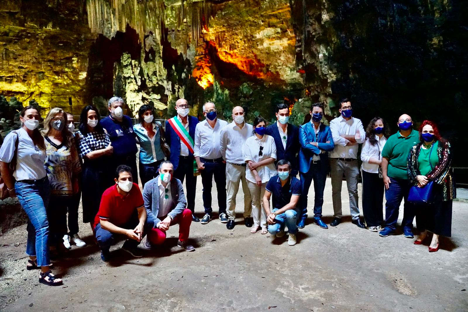 Ad accompagnare il Presidente Emiliano in un breve tour del complesso carsico sotterraneo sono stati il Consiglio di Amministrazione della Grotte di Castellana srl (Presidente Victor Casulli, Vicepresidente Francesco Manghisi e Consigliera Maria Lacasella), il Sindaco di Castellana Grotte Francesco De Ruvo insieme ai componenti della Giunta e del Consiglio Comunale, il professor Alessandro Reina, direttore scientifico, e la dottoressa Giulia Monaco, funzionario direttivo delle Grotte di Castellana.