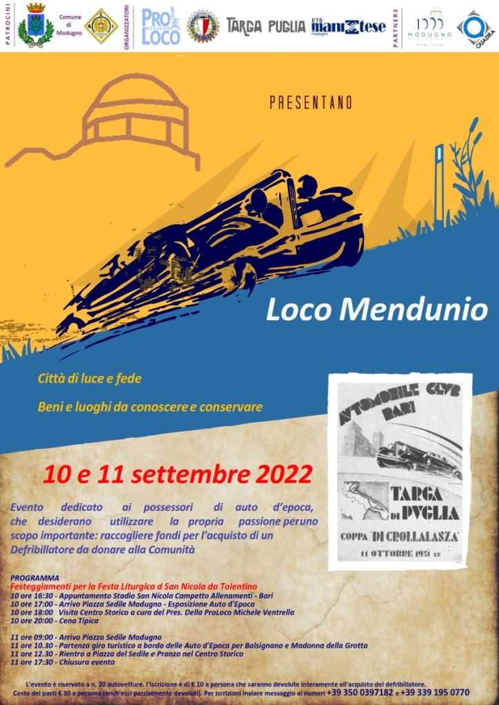 L’evento prevede una quota di partecipazione di 10 euro da parte degli iscritti che sarà interamente destinata ad una raccolta fondi realizzata da Targa Puglia in collaborazione con la Federazione Mani Tese ETS per l’acquisto di un defibrillatore da donare alla comunità di Modugno.
