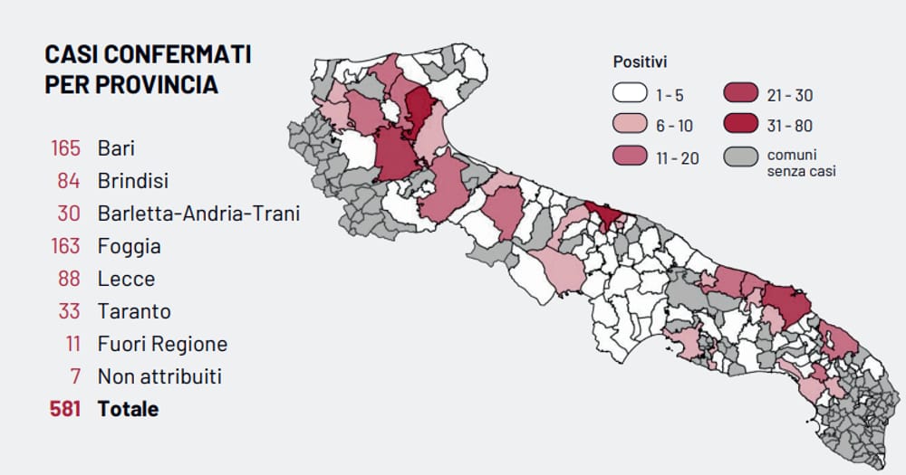 La Regione Puglia ha divulgato la mappa dei contagi. Nel Sud Est Barese risaltano Mola, Polignano a Mare e Rutigliano con zero contagi e alcuni cittadini in quarantena.