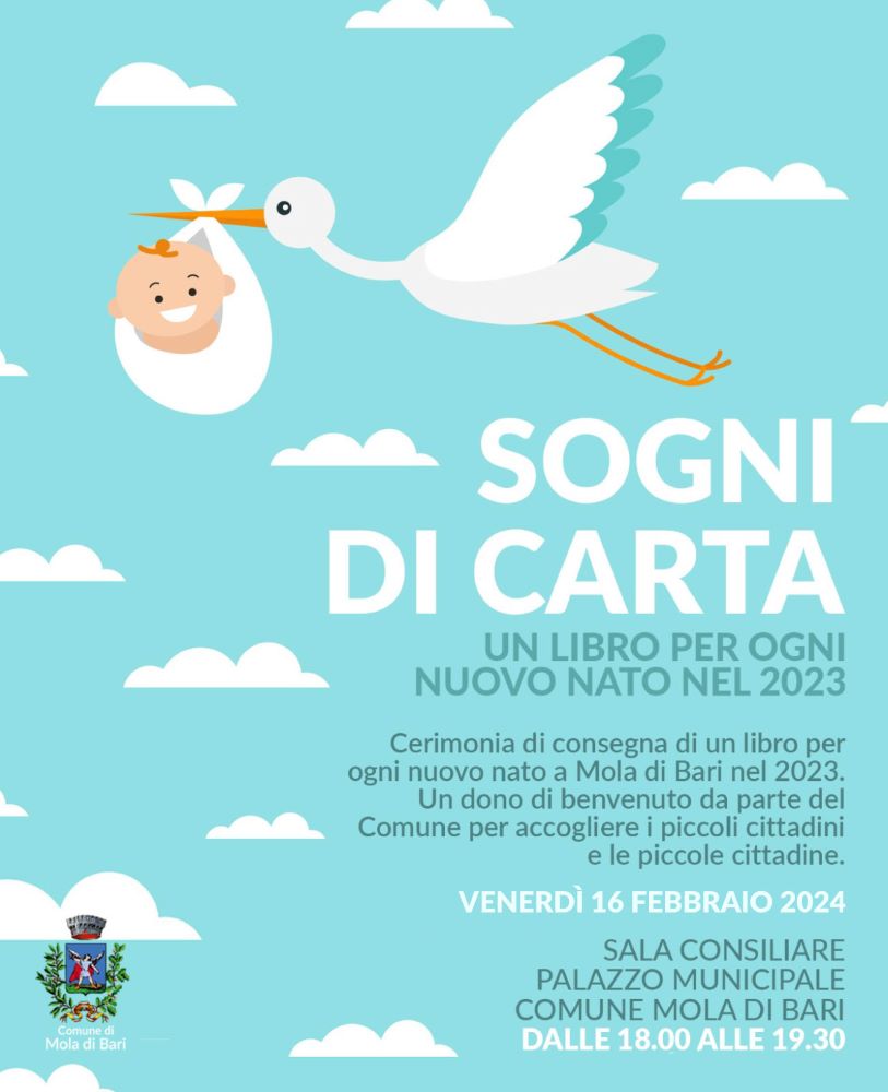 Venerdì 16 febbraio 2024, nella Sala Consiliare del Palazzo Municipale in via De Gasperi a Mola di Bari, si terrà l’iniziativa “Sogni di carta – Un libro per ogni nuovo nato nel 2023”, inizialmente in programma a fine gennaio e poi rinviata per consentire una più capillare informazione ai nuovi genitori.