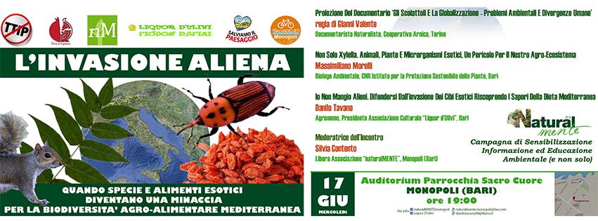 Prosegue la serie di appuntamenti di “Naturalmente 2015” la Campagna di Sensibilizzazione, Informazione, Educazione Ambientale (e non solo) coordinata da naturalMENTE in collaborazione con Salviamo il Paesaggio – Difendiamo i Territori Monopoli, Terra d’Egnazia, #Salvaiciclisti Monopoli e il Comitato di Monopoli Stop TTIP. Si cerca di tenere alto il livello di attenzione sulle emergenze del nostro territorio e del pianeta; attraverso i nostri incontri informiamo, stimoliamo il confronto e il dibattito, approfondendo i problemi che minacciano l’ambiente, proponendo possibili modelli e stili di vita ecologici, esperienze positive e soluzioni, ogni volta con l’intervento di esperti. Soprattutto si vuole che questi appuntamenti siano un momento piacevole, interessante e, come scoprirete, persino conviviale, incontro tra persone diverse. Oggi mercoledì 17 giugno, grazie alla preziosa collaborazione dell’Associazione Culturale ‘Liquor d’Ulivi’, di Bari, parleremo di un argomento importante, ma al tempo stesso oscuro e misterioso: l’INVASIONE ALIENA, ossia quando specie e alimenti esotici diventano una minaccia per la Biodiversità agro-alimentare mediterranea. Si ospita Massimiliano Morelli (Biologo Ambientale, CNR Istituto per la Protezione Sostenibile delle Piante, Bari) e Danilo Tavano (Agronomo, Presidente Associazione Culturale ‘Liquor d’Ulivi’, Bari). La visione di “GLI SCOIATTOLI E LA GLOBALIZZAZIONE – PROBLEMI AMBIENTALI E DIVERGENZE UMANE”, il suggestivo ed eloquente documentario realizzato, dal regista Gianni Valente, per la Cooperativa Ambientale ARNICA di Torino, aiuterà a entrare nel tema. Il documentario, attraverso la storia dello scoiattolo grigio, specie invasiva americana, che ha messo a repentaglio la sopravvivenza del nostro scoiattolo rosso autoctono, racconta con delicatezza la complessa gestione ambientale di una specie aliena, una volta introdotta in un nuovo ecosistema. Al termine della proiezione, con M. Morelli si scoprirà quali animali, piante e microorganismi esotici una volta a contatto con l’ecosistema mediterraneo, hanno un impatto devastante per la nostra agricoltura e i nostri paesaggi, in che modo sono dannosi e cosa si può fare per contenere i loro effetti. Mentre, D. Tavano descriverà, con simpatia, il rapporto agro-dolce (è il caso di dirlo!) tra quelli che qualcuno ha definito ‘gli alieni a tavola’ (cibi esotici, ecc) e la nostra beneamata dieta mediterranea. Provando a sfatare miti e false credenze, e raccontando i veri benefici per la salute di un’alimentazione povera ma bella, lontana dalle mode imposte dal consumismo globale. Saranno benvenute curiosità, domande e provocazioni. Gli organizzatori credono fermamente nell’importanza del “momento del convivio” come mezzo per socializzare, confrontarsi e lasciarsi contaminare, sentendosi più comunità. Difatti, a fine serata sarà possibile degustare le prelibatezze culinarie, in stile vegano o vegetariano, preparate e offerte da alcuni dei partecipanti. Si ricorda a chiunque voglia prender parte al banchetto di portare con sé un piatto, un bicchiere e delle posate, così eviteremo di produrre rifiuti. Le iniziative organizzate nell’ambito di “Naturalmente 2015” sono a costo zero per chi partecipa e profitto zero per chi organizza, perché ZERO dovrebbe essere l’impatto di ciascuno di noi sull’ecosistema!