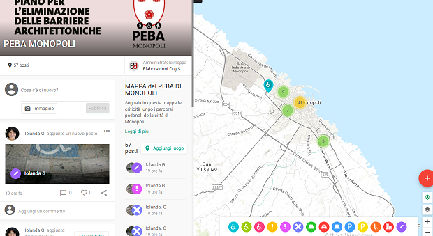 Mappatura partecipata. Invito tutti i cittadini a segnalare attraverso questa piattaforma del Comune di Monopoli le eventuali barriere architettoniche che ci sono in città. Nel suo interno c’è un tutorial che vi spiega come fare. Una città senza barriere migliora la vita di tutti, spesso si tende a pensare che questo sia un problema solo delle persone con disabilità, invece così non è riguarda tutti! Grazie per chi lo farà!