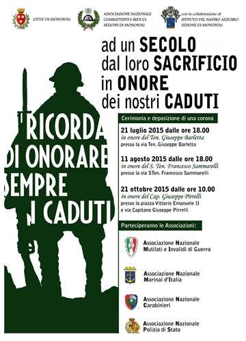 Con il patrocinio del Comune di Monopoli, l’Associazione Nazionale Combattenti e reduci (Sezione di Monopoli) con la collaborazione dell’Istituto del Nastro Azzurro (Sezione di Monopoli) celebra il primo centenario dall’inizio della prima Guerra Mondiale con una serie di appuntamenti. Il primo si terrà martedì 21 luglio dalle ore 18 con la deposizione di una corona d’alloro in via Barletta in onore del Ten. Giuseppe Barletta. Martedì 11 agosto alle ore 18 presso la via ad egli dedicata sarà commemorato con la deposizione di una corona d’alloro il Sergente Tenente Francesco Sammarelli. Infine, mercoledì 21 ottobre alle ore 10 presso piazza Vittorio Emanuele II e via Pirrelli sarà deposta una corona in memoria del Capitano Giuseppe Pirrelli. Alle celebrazioni parteciperanno l’Associazione Nazionale Mutilati e Invalidi di Guerra, l’Associazione Nazionale Marinai d’Italia, l’Associazione Nazionale Carabinieri e l’Associazione Nazionale Polizia di Stato.