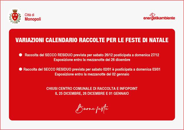 Energetikambiente Monopoli comunica che, durante le festività natalizie sarà garantito il servizio di raccolta rifiuti; tuttavia a causa della chiusura anticipata degli impianti, il calendario subirà le seguenti variazioni: