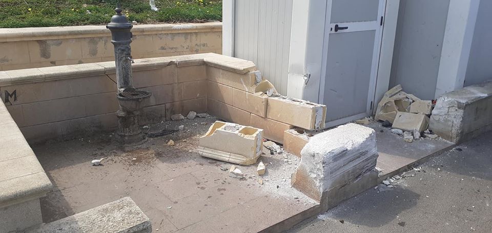 Così si presentano i bagni pubblici di via Pisonio a Monopoli. Sono le conseguenze di un incidente stradale in cui il conducente, dalle tracce lasciate sull’asfalto, deve aver perso il controllo del mezzo per poi sbattere sulla parete.