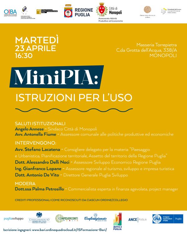 Per meglio comprendere le opportunità di questo strumento, l’Assessora alle Politiche Produttive ed Economiche Antonella Fiume, martedì 23 aprile 2024 alle ore 16,30 nella Masseria Torrepietra (sita in Monopoli alla contrada Torre dell’Acqua n. 338/A) promuove il convegno “MiniPia: istruzioni per l’uso”.