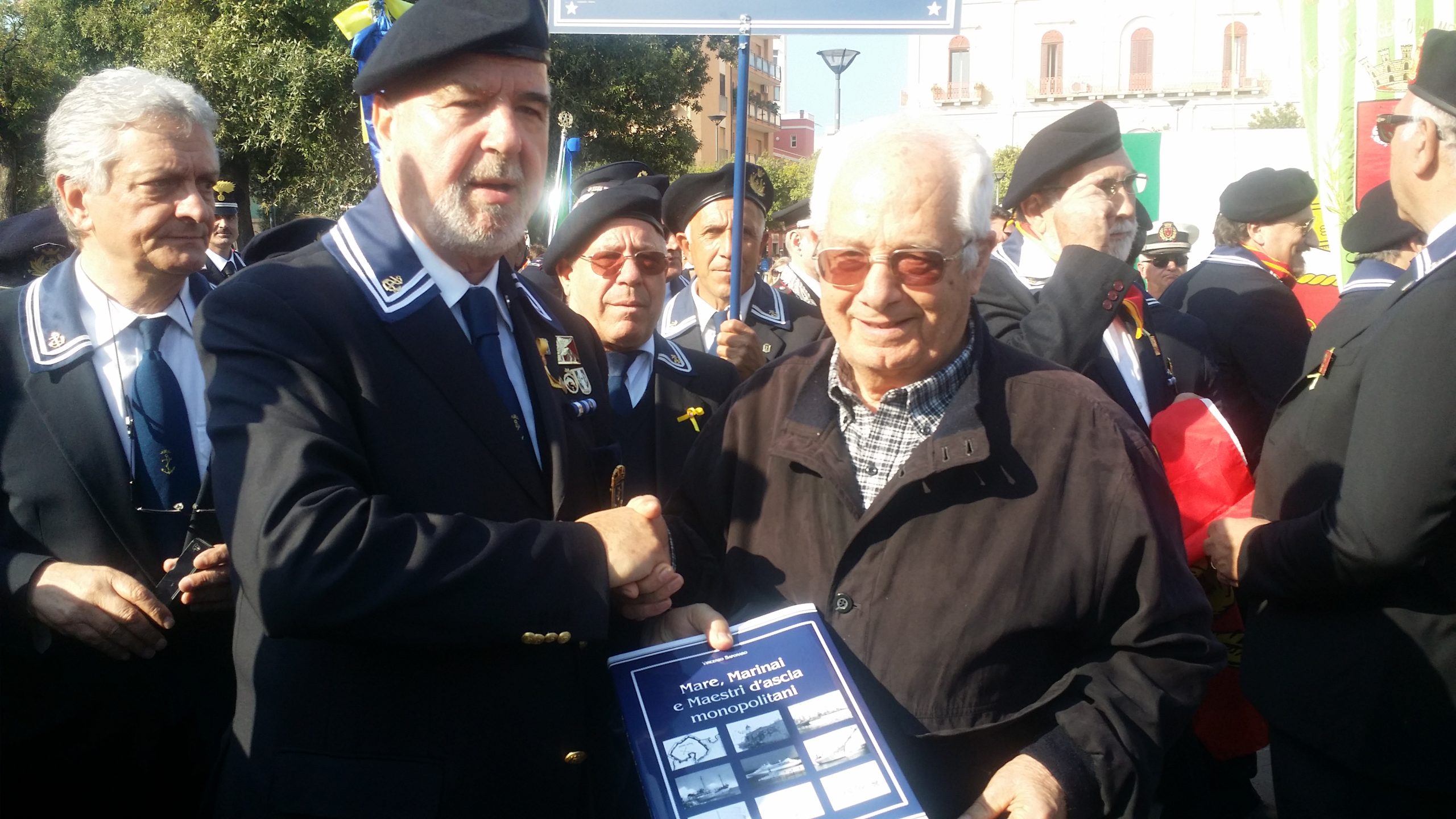 Il maestro d’ascia Vincenzo Saponaro (in foto) lo scorso 07/11/2015 a Monopoli in occasione della celebrazione della ricorrenza del 04 novembre della “Giornata dell’Unità Nazionale e delle Forze Armate”, tenutasi in concomitanza con la Manifestazione Interregionale dell’A.N.M.I., nella quale è rappresentato lo stesso mentre dona il libro di cui è autore “Mare, Marinai a Maestri d’ascia monopolitani” all’Ammiraglio di Squadra Paolo Pagnottella, Presidente Nazionale dell’A.N.M.I.