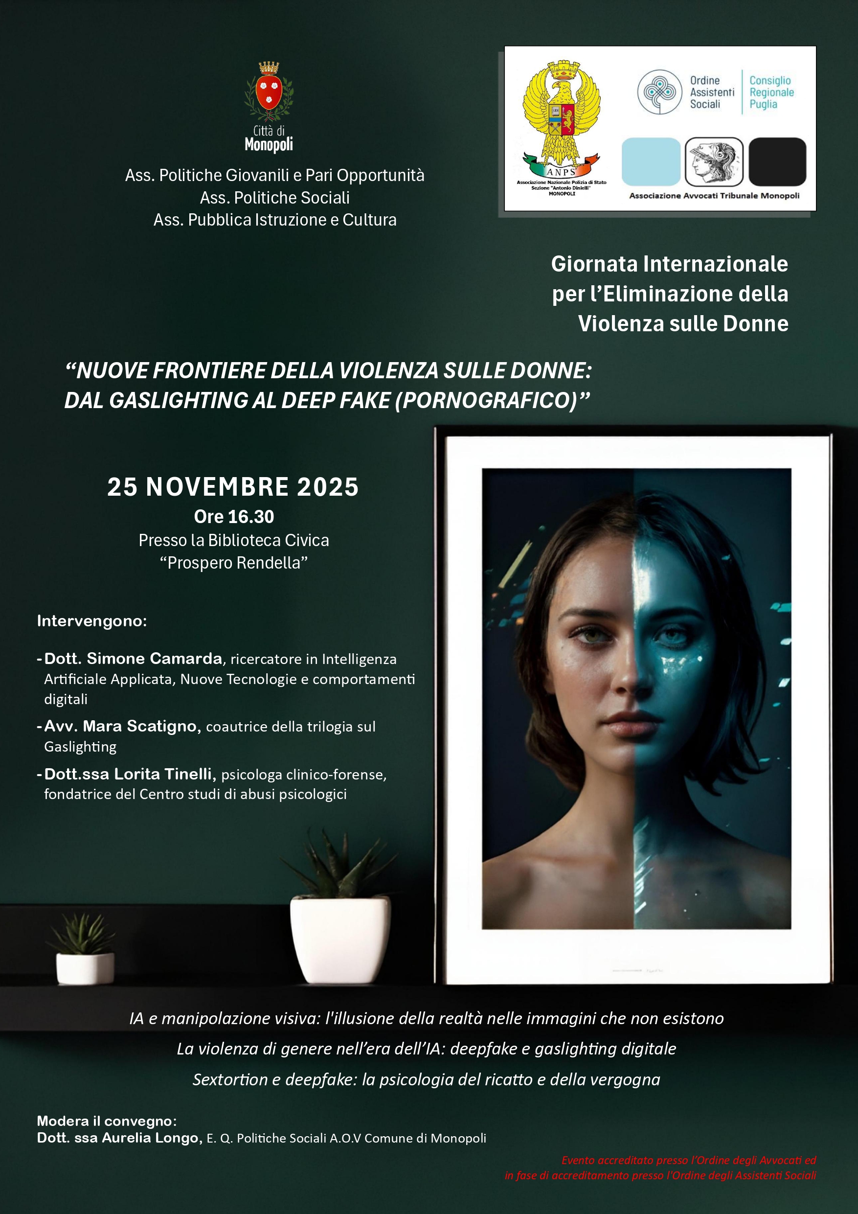 Martedì 25 novembre 2025, dalle 16.30 alle 19.30, la Biblioteca Civica “Prospero Rendella” ospiterà il convegno “Nuove frontiere della violenza sulle donne: dal Gaslighting al Deepfake (pornografico)”, promosso dall’Assessorato alle Politiche Giovanili e Pari Opportunità, dall’Assessorato alle Politiche Sociali e dall’Assessorato alla Pubblica Istruzione e Cultura. L’organizzazione è a cura dell’Associazione Nazionale della Polizia di Stato – Sezione “Antonio Dinielli”.