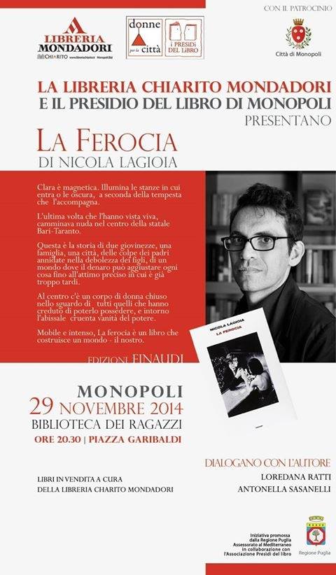 Sabato 29, alle ore 20,30, la Biblioteca dei Ragazzi di Monopoli in piazza Garibaldi accoglierà uno degli scrittori più interessanti della nostra terra, Nicola Lagioia e il suo ultimo romanzo “La ferocia”, ed. Einaudi. L’incontro è organizzato e preparato dalla Libreria Chiarito-Mondadori e dall’Associazione Donne per la Città-Presìdio del libro. Sarà incentrato sulle molte e complesse tematiche che la lettura del libro suscita anche nei lettori più navigati. Sullo sfondo del racconto, infatti, sfilano personaggi, fatti, luoghi riconoscibili della nostra Puglia che, sebbene generati e composti dalla creatività narrativa, non sfigurerebbero nel mondo disegnato dalle cronache più nere della nostra quotidianità Dialogheranno con l’ospite due docenti, Loredana Ratti e Antonella Sasanelli. La serata è dedicata alle donne vittime della ferocia e degli istinti più abietti che connotano alcuni cosiddetti “esseri i Umani”.