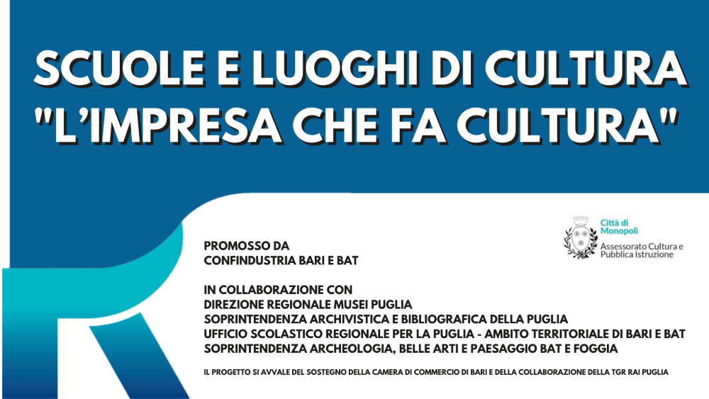L’Assessore alla Cultura Rosanna Perricci comunica che la Biblioteca civica “Prospero Rendella” è stata selezionata come meta di alcune visite d’istruzione nell’ambito del progetto Scuole e Luoghi di Cultura “L’Impresa che fa Cultura” promosso da Tgr Rai Puglia e Confindustria Bari e BAT, in collaborazione con la Direzione regionale Musei Puglia, la Soprintendenza archivistica e bibliografica della Puglia, l’Ufficio Scolastico Regionale per la Puglia – Ambito territoriale di Bari e BAT, la Soprintendenza Archeologia, Belle Arti e Paesaggio BAT e Foggia. Il progetto si avvale del sostegno della Camera di Commercio di Bari.